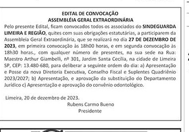 Comunicamos à todos associados que na Assembléia Geral Extraordinária realizada dia 27/12/2023,…