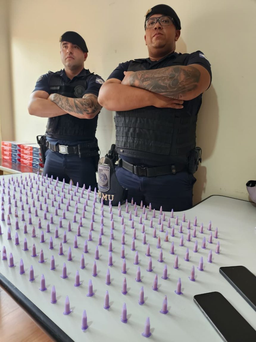 Nas imediações, em uma área verde próxima, foram encontrados dois sacos plásticos contendo mais 288 pinos da mesma substância, idênticos aos que estavam com o abordado, reforçando a suspeita de tráfico.